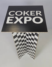 Die Tafel wurde digital gedruckt und aus einem 10-mm-Waben-Displaykarton ausgeschnitten. In die Rückseite sind V-Schlitze eingeschnitten, um ein einfaches Zusammenfalten zu ermöglichen und so ein leichtes Präsentationspodest für Verkaufsförderungs- und Verkaufspräsentationen im Einzelhandel und auf Ausstellungen zu schaffen.