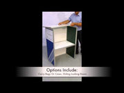 Folding curved portable display counter ideal for exhibitions, events and trade show applications. The dimension for this counter are 1050mm high x 515mm deep and 1072mm wide. This unit has a mid shelf included. Panels are white foam PVC with a folding aluminium frame and open back. The top is locked into position and is made from powder coated steel with a smart aluminium frame.