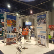 Ce stand d'exposition Truss a une largeur de 5 mètres et une profondeur de 10 mètres. Il mesure 2,5 mètres de haut et pèse 62,5 kg.
